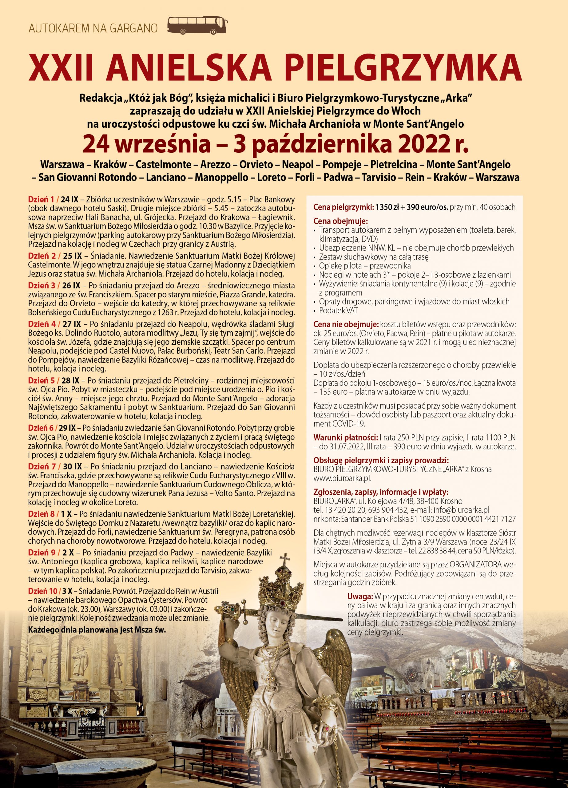 Redakcja „Któż jak Bóg”, księża Michalici i Biuro Pielgrzymkowo – Turystyczne „Arka” zapraszają do udziału w XXII Anielskiej Pielgrzymce do Włoch na uroczystości odpustowe ku czci św. Michała Archanioła w Monte Sant’Angelo 24 IX – 3 X 2022 r.
