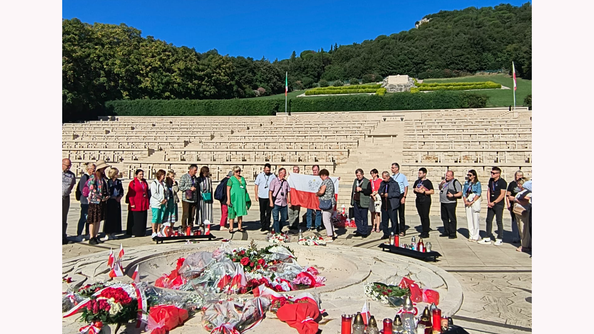 Ponieważ przyjechaliśmy w czasie sjesty nie mogliśmy odprawić Mszy św. w Bazylice, udaliśmy się więc na położony w dolinie Polski Cmentarz Wojennym, gdzie odprawiliśmy Najświętszą Ofiarę modląc się za poległych w intencji poległych żołnierzy 2 Korpusu Polskiego, którzy zginęli w walkach o wyzwolenie Włoch w latach 1944-1945. Na cmentarzu spoczywają ci, którzy przeżyli Monte Cassino, Ankonę, Bolonię – ale nie doczekali powrotu do Ojczyzny. Ich groby, równo ustawione, mówią więcej niż słowa.